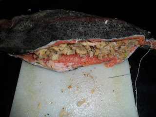Tenemos que comprar la trucha entera sin limpiar, la abrimos por el dorso, no por la parte que general mente se hace, hacemos un corte de la cabeza hacia la cola, cortamos toda la parte que lleva las espinas, y botamos todo lo que lleva dentro (a excepción de los huevos que son deliciosos)